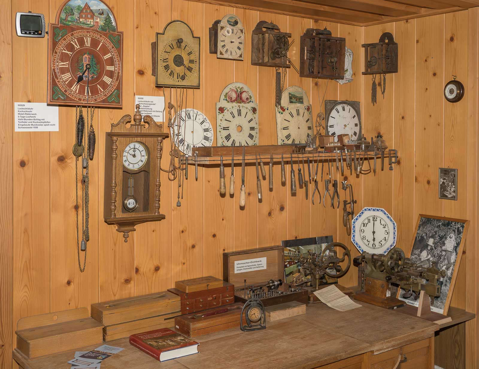 Zuerst wurden die Uhren mit einfachen Werkzeugen wie Zirkel, Bohrer, Säge und Messer hergestellt. Die Erfindung des Zahnstuhls zur Zahnräder-Herstellung und die Verwendung des Spiralbohrers beschleunigten die Produktion. Die hausgewerblichen Uhrmacher konkurrierten bis Ende des 19. Jahrhunderts mit der aufkommenden Uhrindustrie. Die älteste ausgestellte Uhr ist aus dem Jahre 1753.
