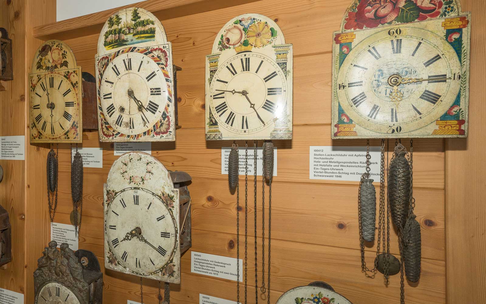Treten Sie ein in die Vielfalt der Uhrenwelt. Es sind alles Schwarzwälder Uhren, die im Laufe der Jahrzehnte ihr Aussehen veränderten. Die ältesten Stücke sind über 250 Jahre alt, Schwarzwälder Uhren mit Holzschild. Sie werden auch Schilderuhren genannt und sind Vorgänger aller späteren Uhren.