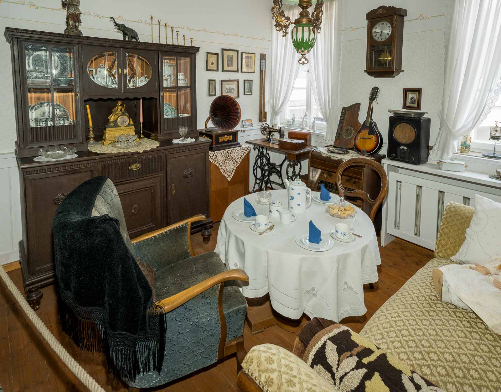 Ein Klavier oder ein Grammophon war um die Jahrhundertwende zum 20. Jht. in vielen Wohnungen zu finden, so wie in unserer Zeit Fernseher, Video oder PC. Dieses Wohnzimmer hatte bereits elektrisches Licht, in der Küche leuchtete dagegen die Petroleum-Lampe, wenn die Tage kürzer wurden.