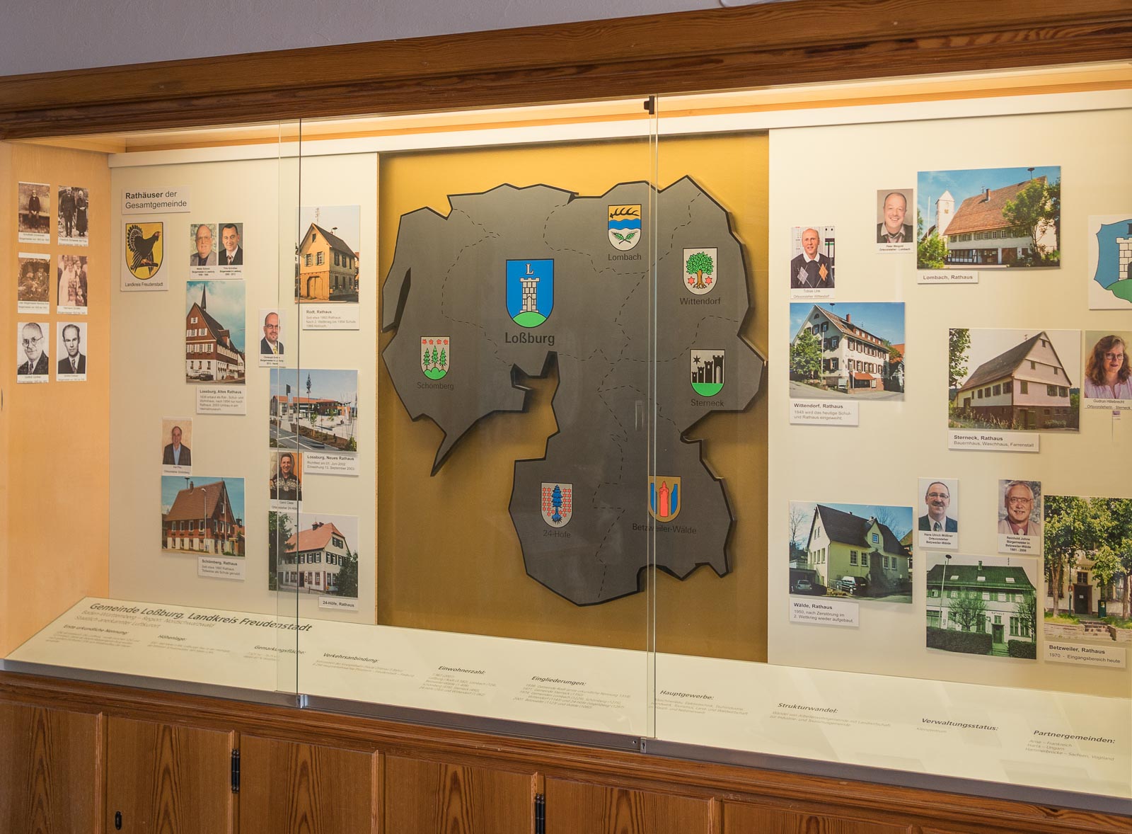In der Vitrine finden Sie die aktuelle politische Gemeindefläche mit den Wappen des Hauptortes und der 6 Teilorte. Frau Margot-Jolanthe Hemberger, Lossburger Bildhauerin und Malerin hat dieses Werk geschaffen. Werke von Frau Hemberger werden Ihnen hier im Haus und in Loßburg immer mal wieder begegnen, z.B. auf der Kunstmeile Loßburg, einem Audioguide geführten Rundgang.