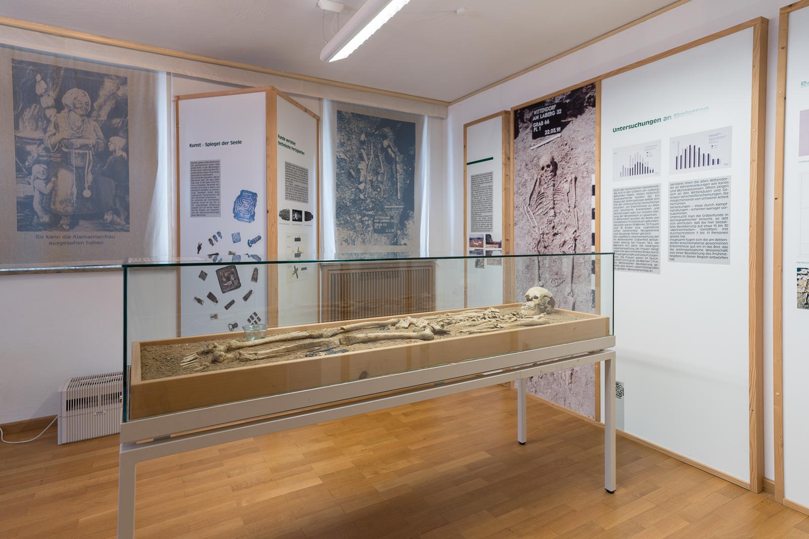 Neben dem ausgestellten Skelett einer 20- bis 25-jährigen Frau sind in den Vitrinen Original-Grabbeigaben wie Waffen, Schmuck und Gebrauchsgegenstände mit ausführlichen Hinweisen und Beschreibungen ausgestellt.