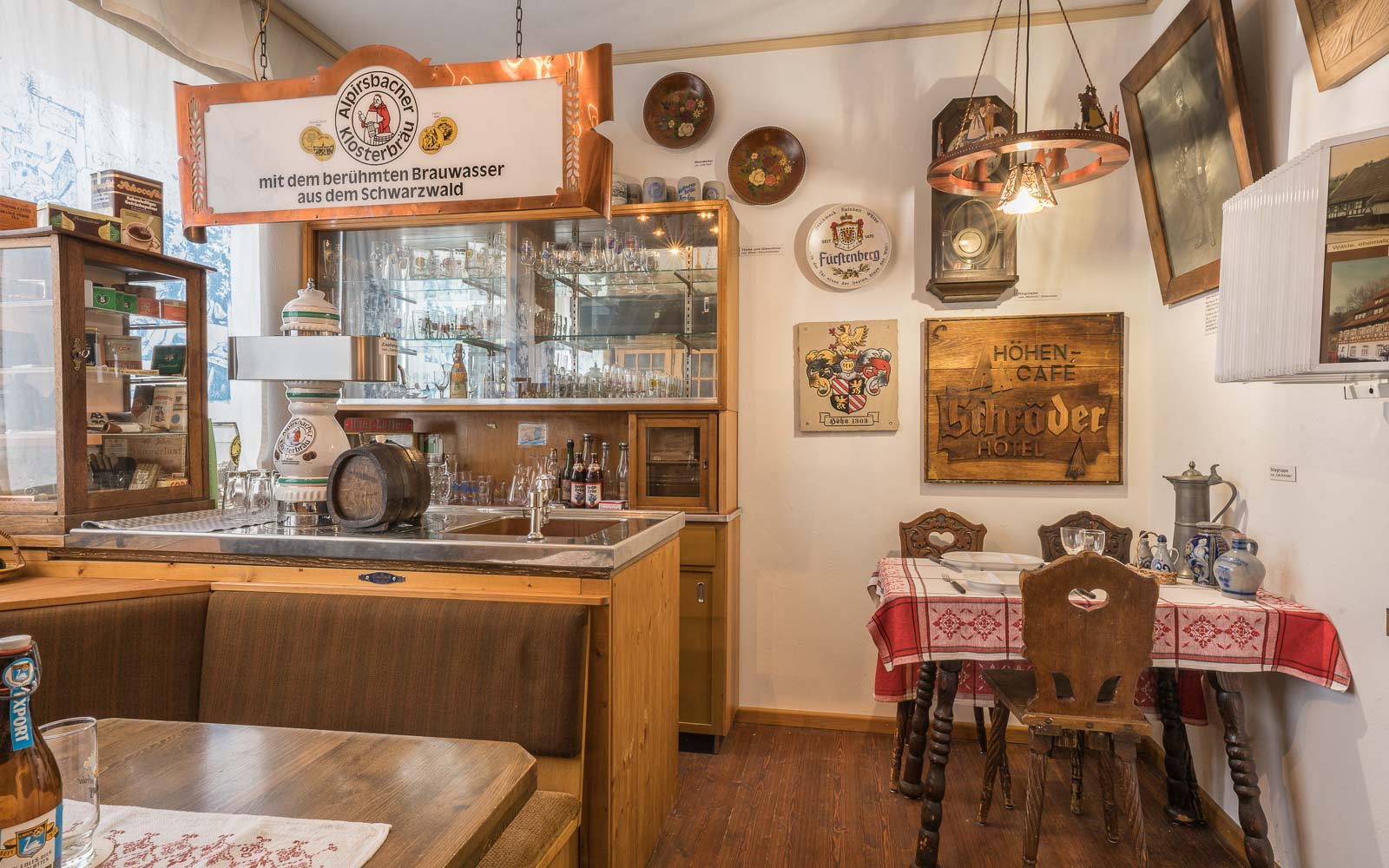 Unser Stammtisch mit Eckbank stand früher im „Café Schröder“, die prächtige Stammtischlampe beleuchtete Gäste der „Rose“ in Freudenstadt. Die Zapfanlage funktioniert noch – Sie brauchen es nicht ausprobieren und wenn sie einen noch so großen Durst verspüren – das Fass unter der Theke ist leer. Zum anderen verweist das Schild am Eingang darauf, dass heute leider Ruhetag ist.